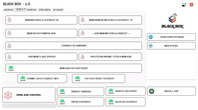 Black Box v1.0 is free Android tool for MDM, FRP removal, factory resets, and more. Explore key features like Android-specific functionalities, XIAOMI FRP Assistant Mode, SAMSUNG FRP #0# Mode, inbuilt ADB control tool, reboot options, MDM and IT functions, and Motorola fastboot capabilities.